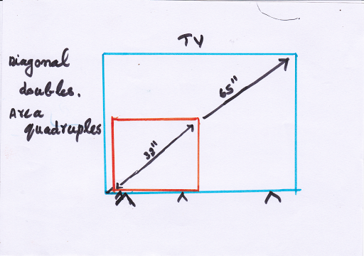 A 65 inch TV has a width of 56.7 inches and a height of 31.9 inches. All are doubled compared to 32 inch TV. But the area is 1809 square inches. The area has increased more than four times. Hence the 65 inch TV will be equal to four 32 inch TV. Hence the price also will increase four times. That is the Math of TV size and price.