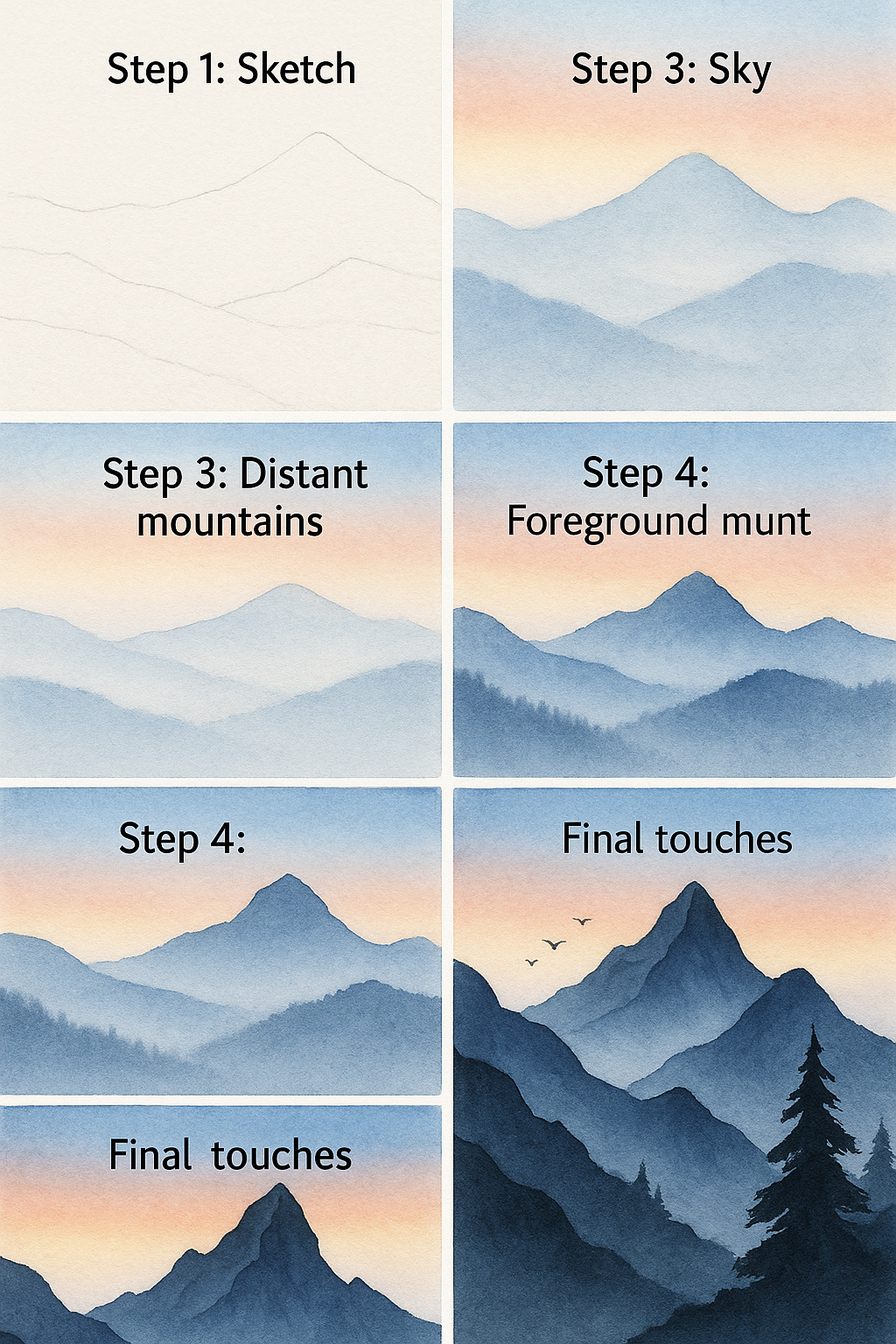 🏞️ Watercolor Mountain Landscape – Step-by-Step